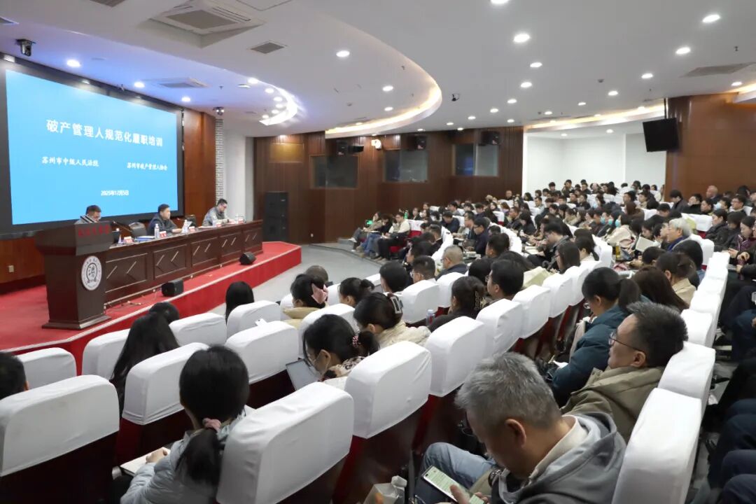 为进一步促进管理人履职规范化,提升管理人履职水平,2025年12月5日,苏州市破产管理人协会联合苏州市中级人民法院,在苏州大学王健法学院共同举办 2025 年度苏州破产管理人规范化履职培训。苏州破产法庭、苏州中院司法鉴定处、市破产管理人协会相关负责同志,苏州两级法院破产审判法官,以及苏州法院破产管理人名册内机构、协会会员等 300 余人参加培训。