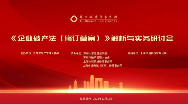 2025年12月12日下午,《企业破产法(修订草案)》解析与实务研讨会在苏州香格里拉酒店举行。本次研讨会由江苏省破产管理人协会主办,苏州大学王健法学院、苏州市破产管理人协会、上海市锦天城律师事务所、上海市锦天城(苏州)律师事务所联合承办,上海律泊科技有限公司提供支持。众多专家学者、资深律师及企业代表齐聚一堂,围绕破产重整领域的实务热点、制度创新与技术应用展开深度研讨,为行业高质量发展注入新动能。